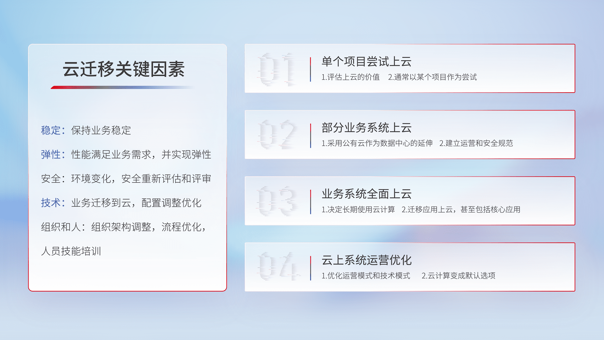 结合实际业务,,,,从规划设计、、、、云平台选型、、云原生改造、、、数据迁移、、、、集成交付,,迁移全过程为客户识别最佳上云路径,,,,做好风险识别管理,,,设计网络架构、、、、身份权限、、、、安全审计合规、、、、操作审计、、日志审计、、监控告警策略、、、、多站点容灾设计等,,,对云上基础设施进行整体规划,,,提升IT治理水平,,,以满足弹性、、高可用、、、、高性能的需求。。。