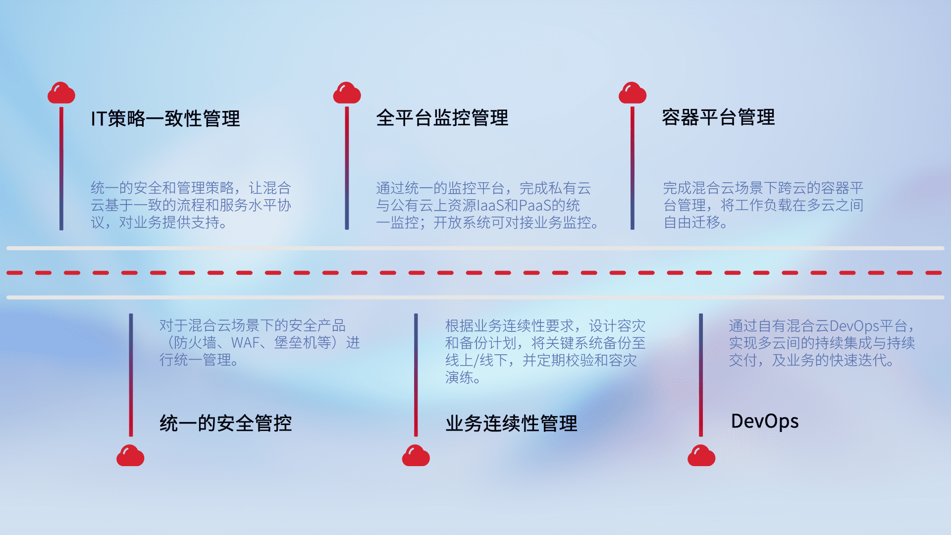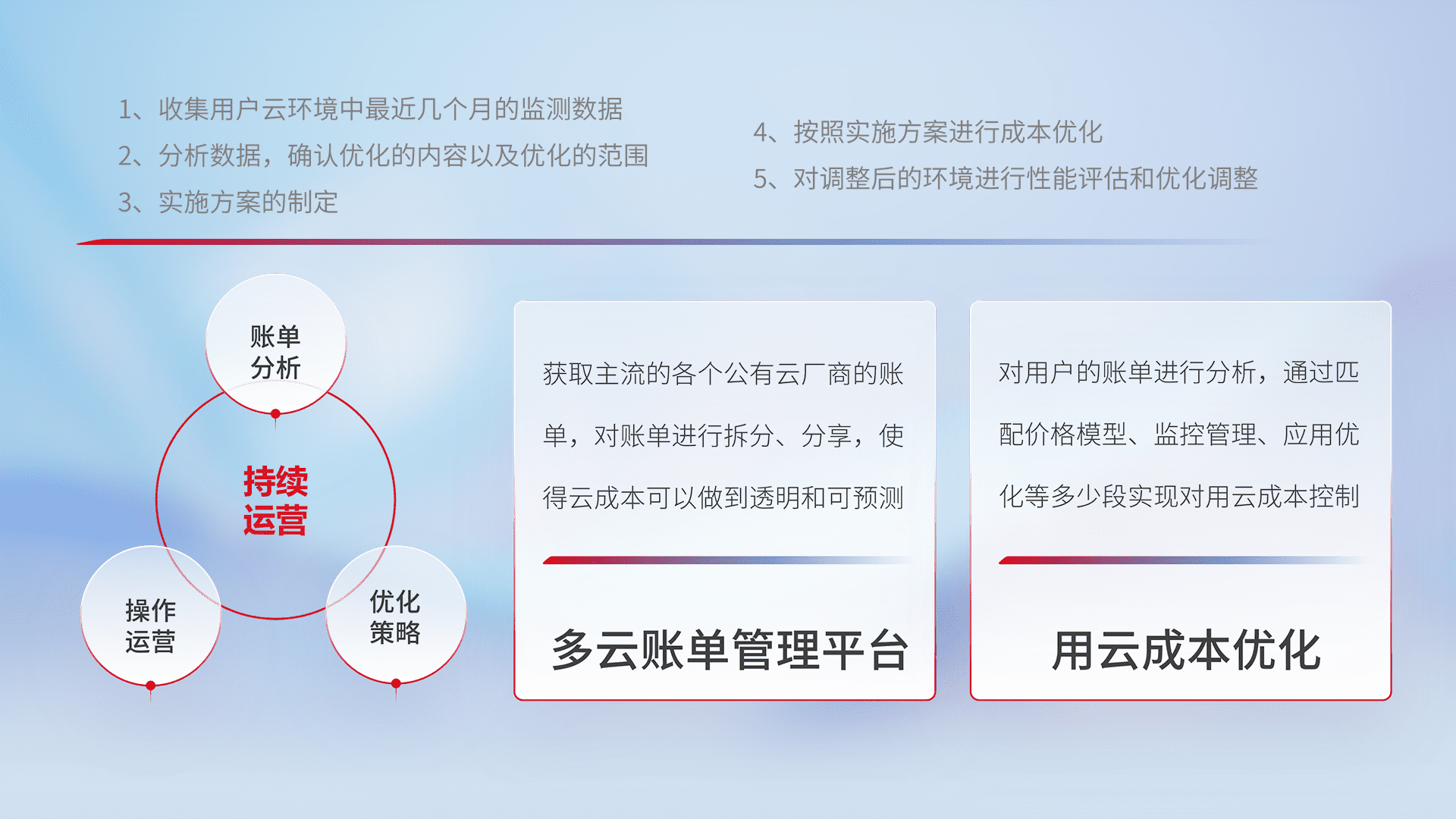通过多云纳管,,,以统一的资源数据模型把客户的云资源进行抽象和封装,,,,进而实现对多云资源的统一操作,,,保障云资源管理的可靠性、、、、稳定性与可用性。。。。量身定制化运维内容,,,,配置、、开发运维、、补丁管理、、、备份、、、监控、、认证和访问管理、、审计和日常巡检等,,,保障在用云过程中的可靠度,,,,稳定度以及高可用率。。。。